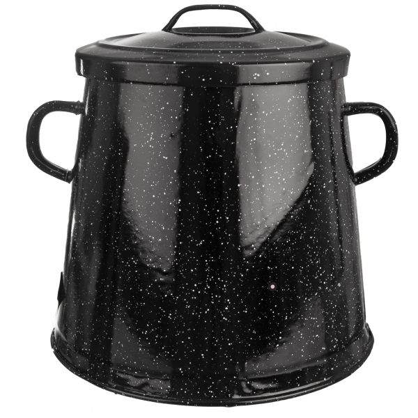 Nádoba na uskladnění sádla s víčkem a dvěma uchy. Materiál: kov, smaltovaný povrch. Rozměry: objem 11 l, pr. 29/22 cm, 25/29 cm. przeczytaj całość