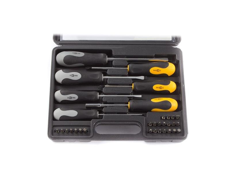 Sada šroubováků BECCO Obsah sady:- ploché 4 x 100, 5 x 100, 6 x 100, 8 x 150 mm- křížové PH1 x 75,PH2 x 100- bity:- křížové PH0, PH1, PH2, PH3,- pozidrive PZ1, PZ2, PZ3,- ploché 2, 3, 4, 7 mm- torxy T10, T15, T20, T25, T27, T30, T40- imbusy H2, H2,5, H3, H4, H5, H6- šroubovák na bity przeczytaj całość
