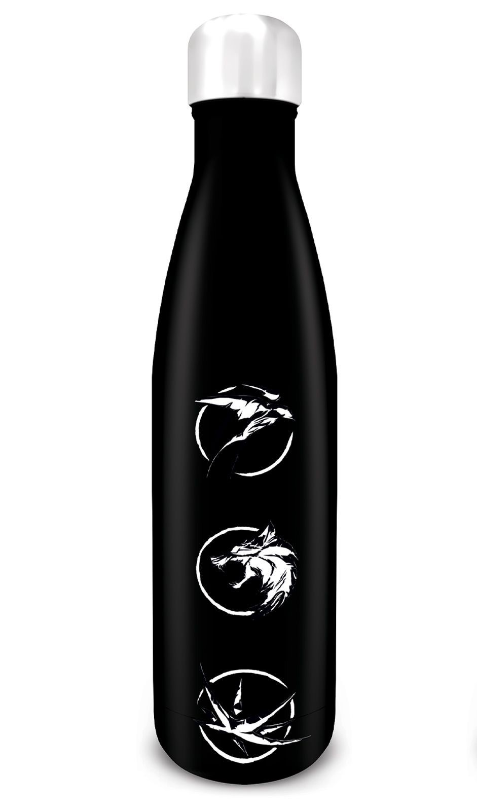Czarna stalowa butelka na wodę z symbolami należącymi do głównych bohaterów serialu fantasy Wiedźmin od Netflixa - z wilkiem Geralta z Rivii, jutrzenką czarodziejki Yennefer i jaskółką księżniczki Ciri, lwiątkiem z Cintry. Świetny towarzysz dla wszystkich aktywnie żyjących i spragnionych... przeczytaj całość