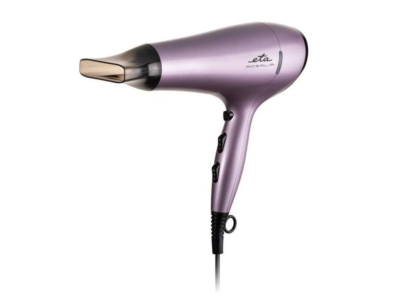 Pod něžným designem fénu ETA Rosalia se skrývá výkonný motor a funkce vyladěné tak, aby vás domácí styling vlasů bavil a zároveň dovedl k vytouženým výsledkům. Oddělené spínače na rukojeti nabízí pohodlné nastavení teploty vzduchu s výběrem ze tří stupňů i možnost volby ze dvou rychlostí proudění. Úpravu vlasů urychlí koncentrátor vzduchu otočný o 360°, který soustředí proud vzduchu na právě opečovávaný pramen. Součástí balení je také difuzér, který dodá objem u kořínků a podpoří přirozené zvlnění jednotlivých pramínků. Aby vás výsledný účes zdobil ještě dlouho poté, co opustíte koupelnu, je fén ETA Rosalia vybaven funkcí ionizace a studeného vzduchu. Ionizátor vytváří záporné ionty, které předchází vzniku statické elektřiny, a tím i krepatění vlasů. Ty jsou pak znatelně hladší a lesklejší. Pomyslnou třešničkou na dortu je studený vzduch, který se postará o závěrečnou fixaci účesu. Ergonomicky tvarovaná rukojeť je doplněna praktickým poutkem na zavěšení. V zadní části fénu se nachází odnímatelná mřížka, která usnadňuje údržbu spotřebiče a chrání jeho útroby před vniknutím vlasů, prachu a dalších nečistot. Pro maximální bezpečí nechybí ani pojistka proti přehřátí.