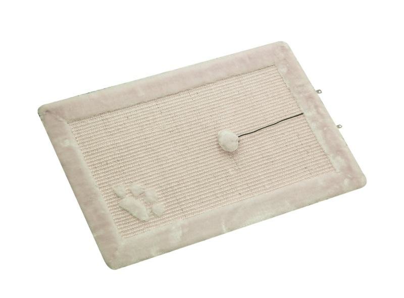 - škrabací podložka lemovaná plyšem - vyrobeno ze sisalu - plyšová bambulka s rolničkou na gumičce - umožňuje kočce provozovat své škrabací zvyky - může být položeno na zemi, nebo upevněno na stěně - škrabadlo co nezabírá místo - velikost 58x37cm Broušení drápků je pro kočky velmi důležité. Aby se předešlo tomu, že by kočka poškrábala koberec nebo nábytek, je nezbytné jí poskytnout nějaký jiný vhodný objekt a materiál ke škrábání. Sisal je přírodní, velmi masivní vlákno, které kočkám pomáhá zbavit se šupinovité svrchní vrstvy na jejich drápcích a tím je zabráněno zarůstání drápků. Podložka může být připevněna na zeď nebo položena na podlahu. K podložce je připevněna hračka na pružině.