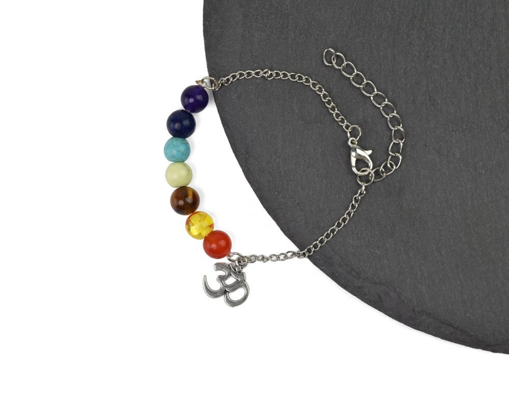 Náramek posiluje sedm hlavních čaker.ÓM je symbolem absolutna a sjednocení.Parametry: Délka: 19-24 cmPrůměr jedné kuličky: 8 mm Materiál: plast, kov przeczytaj całość