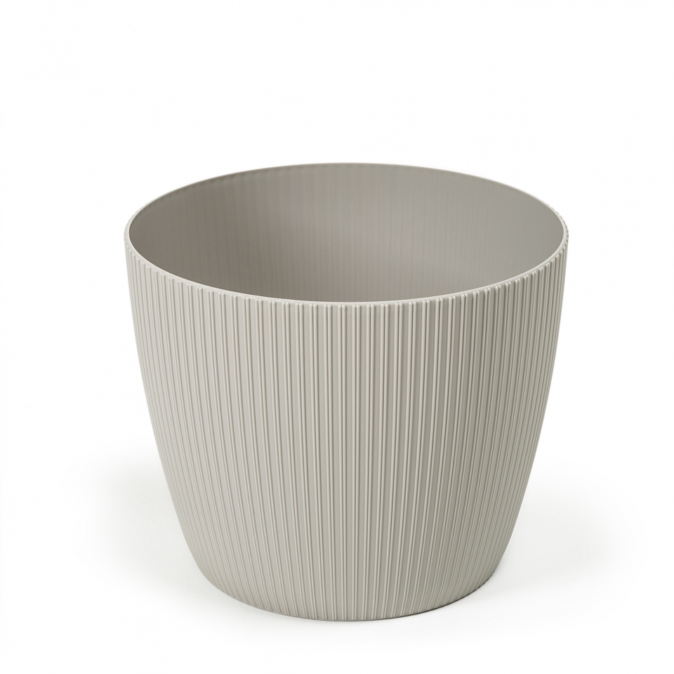 Plastový květináč Magnolia Jumper z vnější strany zdobený proužkem. Květináče jsou vhodné do interiérů i ven. Barva: taupe Rozměr: výška 26 cm průměr 30 cm przeczytaj całość