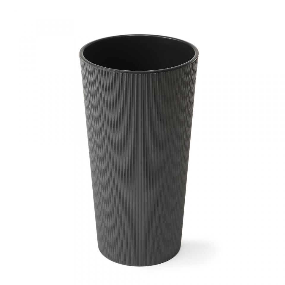 Vysoký plastový květináč z vnější strany zdobený proužkem a matným povrchem, kónického tvaru a s vyjímatelnou černou plastovou vložkou. Do plastové vložky můžete rostliny přímo sadit, pokud do dna této vložky vyvtráte odtokové otvory. Barva: grafitová Rozměr: výška 57 cm průměr v horní části 30 cm przeczytaj całość