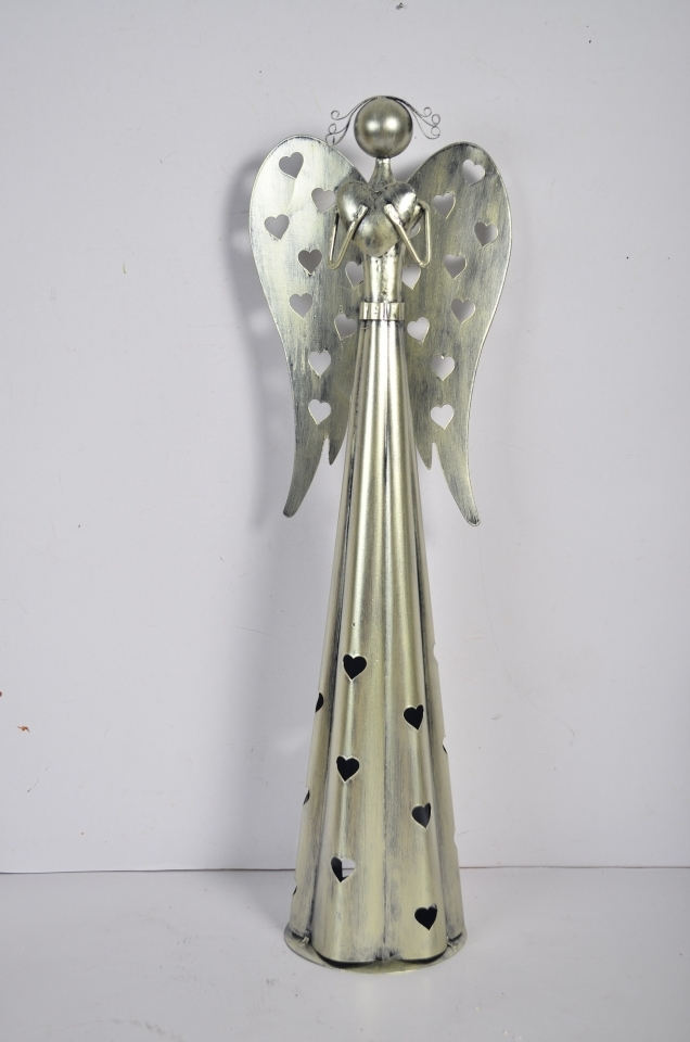 Plechový srdíčkový anděl na čajovou svíčku, 38 cm, champagne