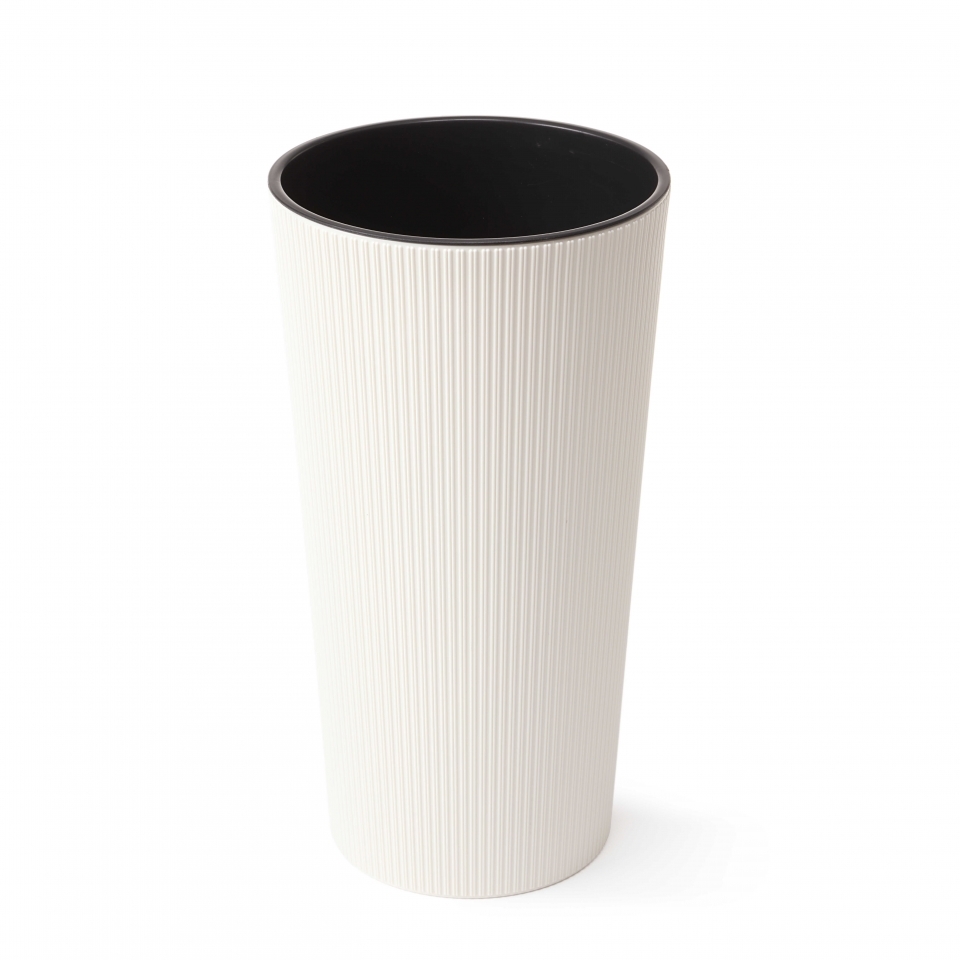 Vysoký plastový květináč z vnější strany zdobený proužkem a matným povrchem, kónického tvaru a s vyjímatelnou černou plastovou vložkou. Do plastové vložky můžete rostliny přímo sadit, pokud do dna této vložky vyvtráte odtokové otvory. Barva: krémová Rozměr: výška 46,5 cm průměr v horní části 25 cm przeczytaj całość