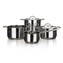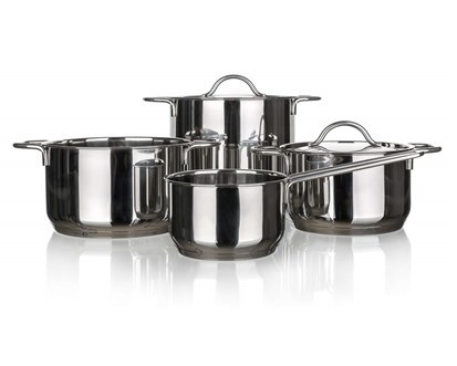 Sada nerezového nádobí AURA 6 ks obsahuje: rendlík 14 x 9 cm bez poklice, hrnec 18 x 11 cm s poklicí, hrnec 20 x 12 cm s poklicí, vysoký hrnec 20 x 18 cm bez poklice. Nádobí lze používat na všechny typy sporáků. Poklice jsou vyrobeny z nerezi. Povrchová úprava nerezi lesk (uvnitř i vně). Nádobí se snadno udržuje, lze mýt v myčce. Držadla jsem k hrncům i poklicím natavena.