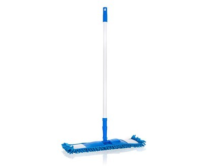 Mop plochý žinilkový s teleskopickou tyčí 68 - 120 cm, barva mopu tmavě modrá, tyč bílá s tmavě modrými plastovým prvky, materiál: žinylka 80% polyester / 20% polyamid. przeczytaj całość