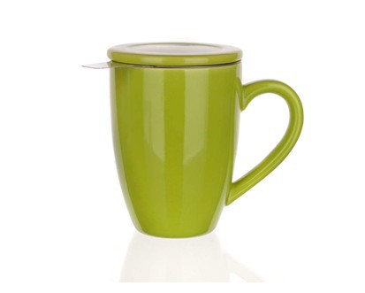 Hrnek s víčkem 350 ml BONNET, zelená glazura, materiál - keramika, nerezové sítko na louhování čaje. Rozměry hrnku: výška 12 cm, průměr 8,5 cm. Hrnek i víčko lze používat do mikrovlnné trouby a mýt v myčce na nádobí. przeczytaj całość