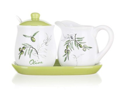 4-częściowy zestaw mlecznik z cukiernicą OLIVES. Zestaw zawiera: mlecznik, cukiernicę, łyżeczkę, spodek. Zestaw wykonany jest z ceramiki z motywem oliwek. przeczytaj całość