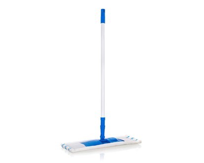 Mop plochý s mikrovláknem a teleskopickou tyčí 68 - 120 cm, barva těla mopu: tmavě modrá, mikrovlákno bílé s modrými stripy, materiál: 80% polyester / 20% polyamid. przeczytaj całość
