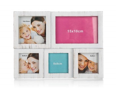 Fotorámeček na 5 fotografií ve velikosti 3x 8x8 cm, 1x 10x10 cm a 1x 15x10 cm, je vybaven praktickými závěsy k montáži na stěnu (hmoždinky a vruty nejsou součástí balení). Celkový rozměry rámečku : 29,5 x 21,8 x 2,5 cm. przeczytaj całość