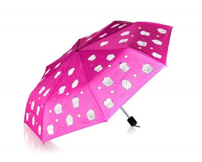Deštník skládací 52 cm v růžové barvě s dorty, slouží k ochraně proti dešti a přímému slunci. Je vyroben z nepromokavého materiálu polyester. Při namočení mění barvu obrázků. przeczytaj całość