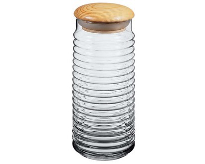 Szklany słoik BABYLON 1,5 l z drewnianą pokrywką; słoik wykonany jest z przezroczystego szkła, pokrywka wyposażona jest w gumową uszczelkę. przeczytaj całość