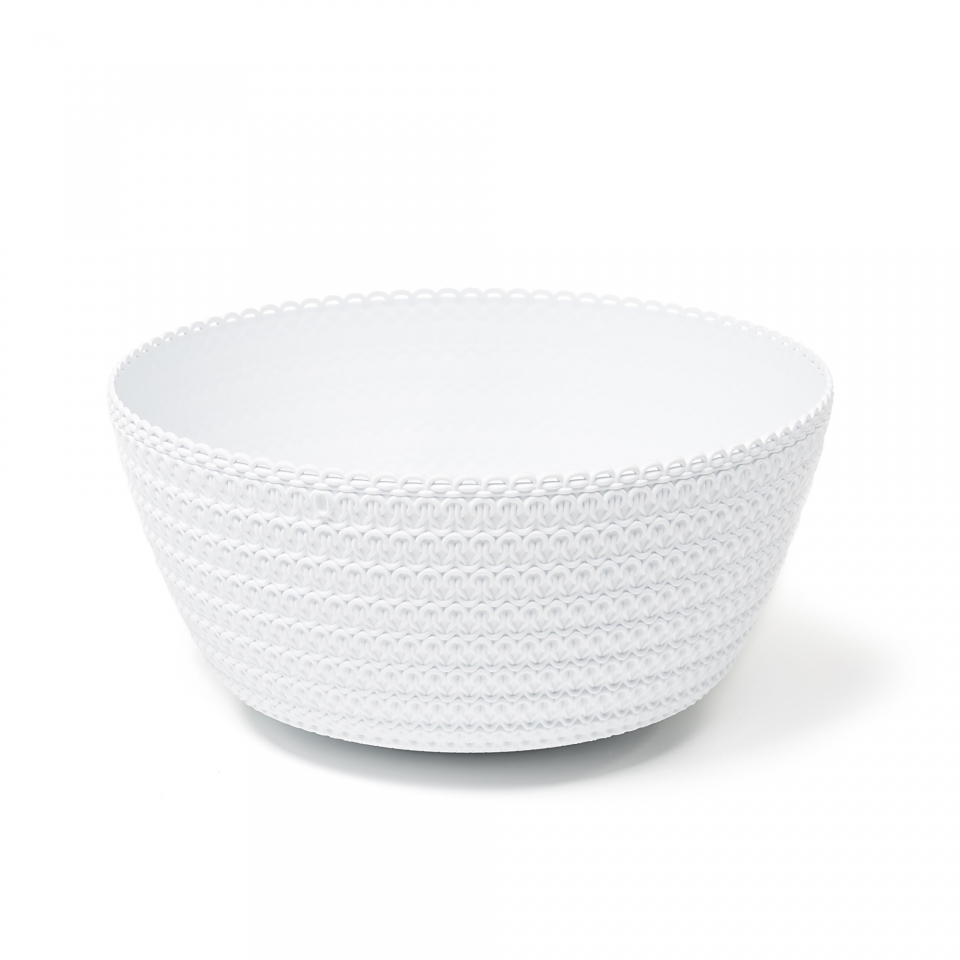 Plastikowa doniczka Bowl Jersey z zewnętrznej strony ozdobiona plecionym dekorem. Doniczki nadają się do wnętrz i na zewnątrz. Kolor: biały Wymiary: wysokość 13,2 cm średnica 24 cm przeczytaj całość