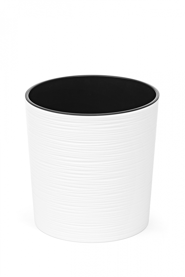 Niska plastikowa doniczka żebrowana o matowej powierzchni, lekko stożkowego kształtu i z wyjmowaną czarną plastikową wkładką. Do plastikowej wkładki można rośliny sadzić bezpośrednio, a do doniczki można też dokupić osobno system samozalewania, dzięki któremu podlewanie będzie zawsze pod kontrolą. Barwa: biała Rozmiar: wysokość 255 mm średnica w górnej części 250 mm
