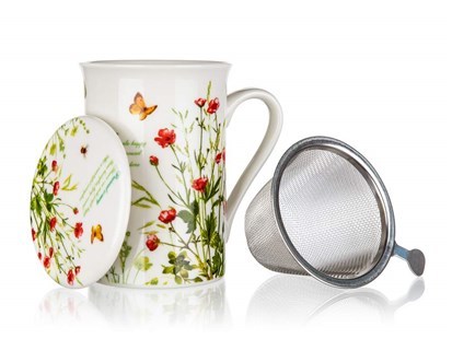 3-częściowy zestaw do herbaty MEADOW FLOWERS przeznaczony do parzenia herbat sypanych. Zestaw zawiera: 1 x ceramiczny kubek o pojemności 300 ml (wysokość 10 cm, górna średnica 7,6 cm, dolna średnica 6,9 cm), 1 x stalowe sitko (średnica 7,5 cm, wysokość 6,5 cm) oraz 1 x ceramiczna pokrywka /... przeczytaj całość