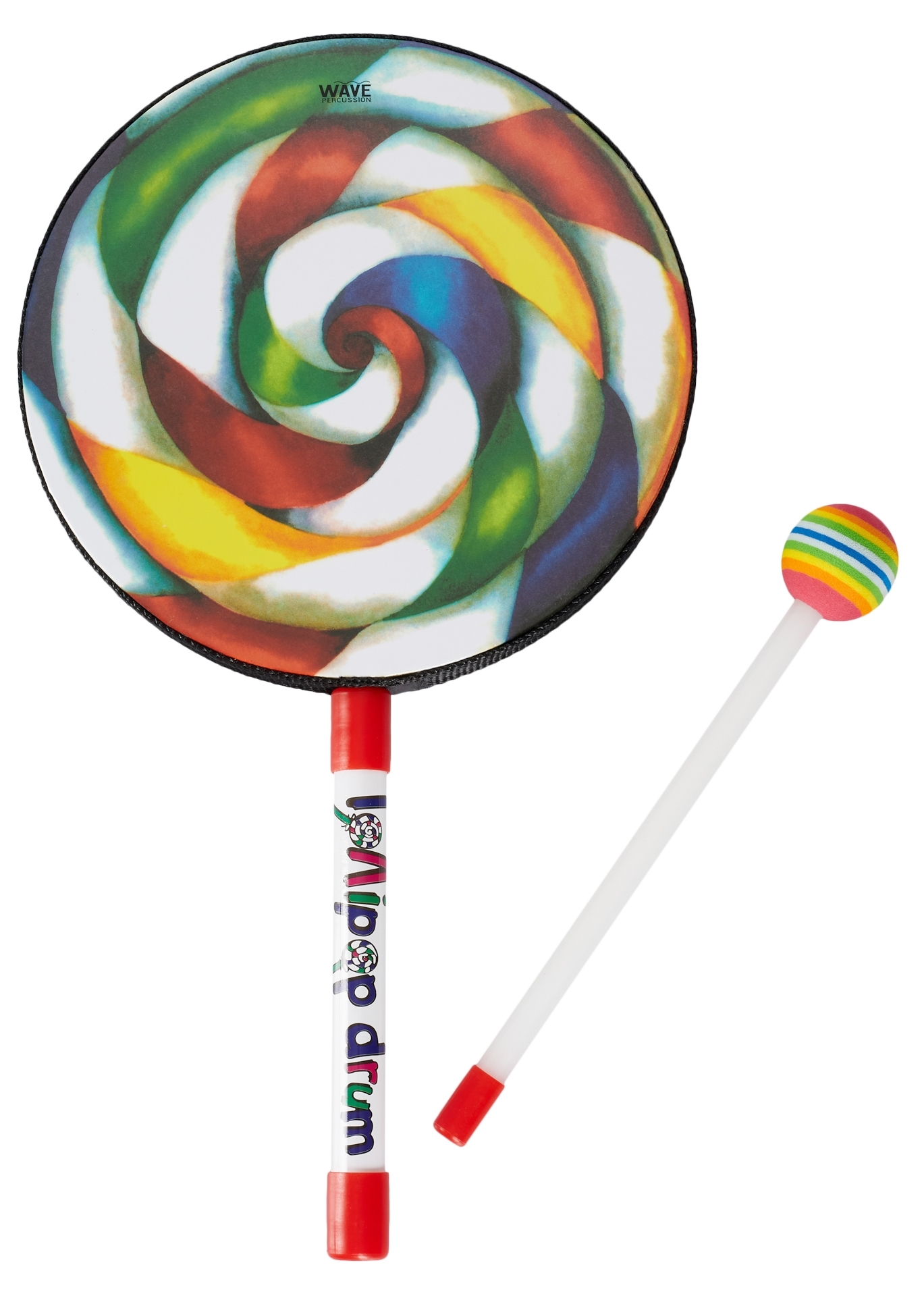 Tento dětský bubínek ve tvaru „lízátka“ se pohodlně drží a poskytuje příjemně vřelý zvuk. Součástí je také palička s pěnovou koulí na konci.