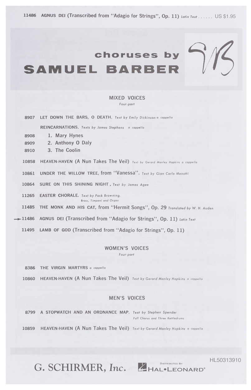 Tato kniha obsahuje notový záznam díla vhodného pro sbory se soprány, alty, tenory a basy. Agnus dei, tedy Jehňátko boží, je součást Barberova opusu číslo 11, Adagio for Strings a patří mezi nejpopulárnější díla americké vážné hudby často používaná v televizi a filmech....