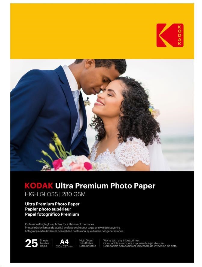 KODAK Ultra Premium Photo RC Gloss (280g/m2) A4 - 25 listů Prémiový fotografický papír formátu A4 je vhodný pro všechny inkoustové tiskárny. Gramáž 280 g/m2 představuje variantu pro nejnáročnější použití. Vytiskněte si profesionální fotografie s vysokým leskem pro celoživotní...