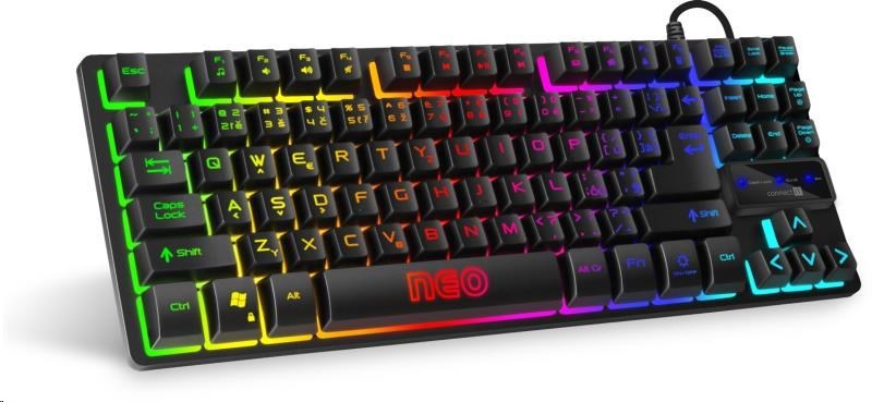 Profesjonalna gamingowa klawiatura NEO Compact jest wyjątkowa dzięki konstrukcji TKL (Ten Key Less), czyli bez części numerycznej, co zapewnia więcej miejsca na biurku na ruch myszy po podkładce. Klawiatura posiada układ czeski i słowacki oraz 2 tryby kolorowego podświetlenia rainbow i trzystopniową regulację intensywności podświetlenia.