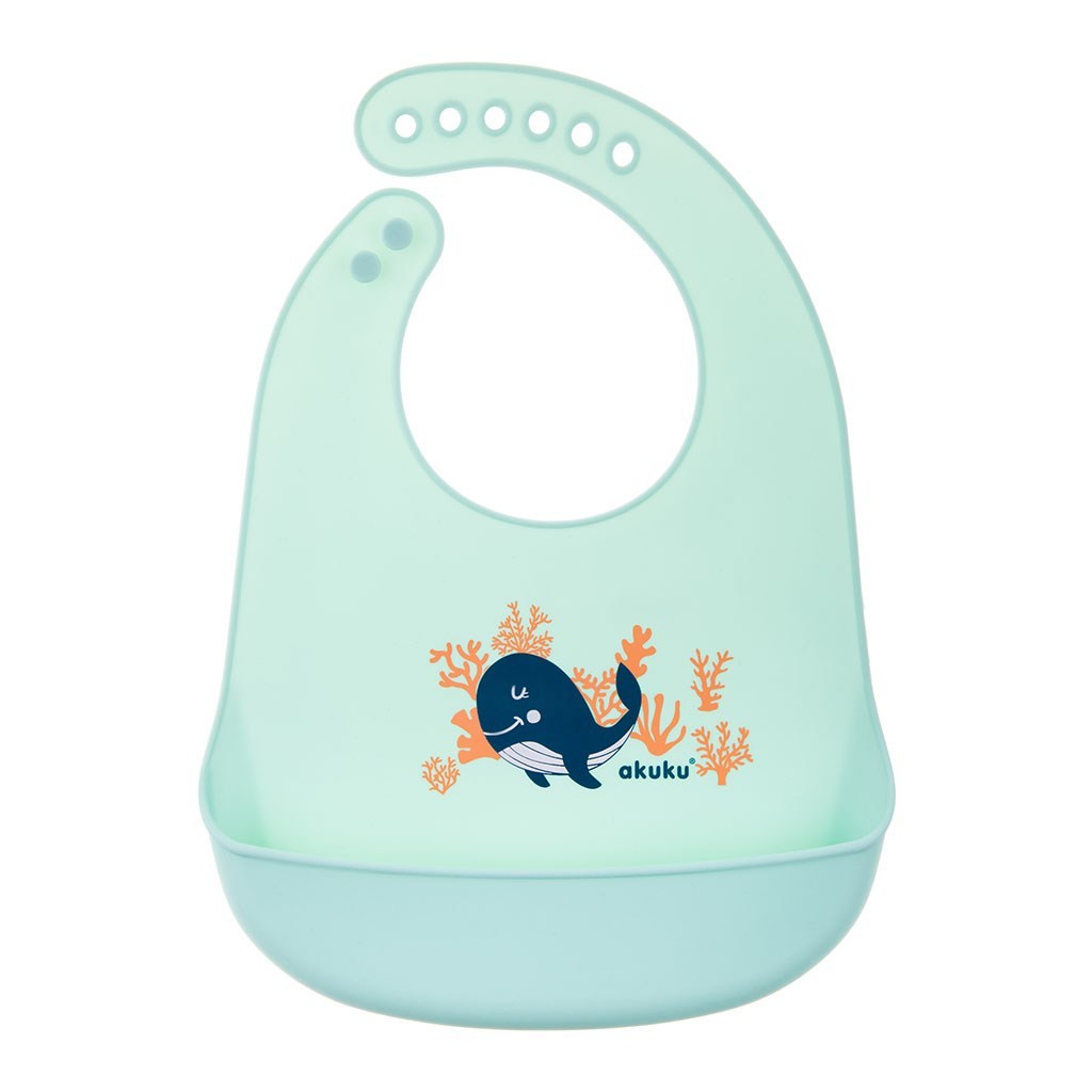 Nastavitelný dětský silikonový bryndák s kapsičkou Akuku velryba mátový