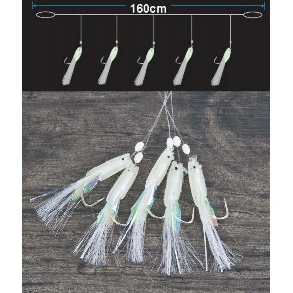 Systém pro lov makrel spěti háčky. Nad háčkem jsou bílé korálky a na háčku je bílá imitace rybí hlavičky a fluorescenční folie s bílými střapci.160cm1/00,60mm5311050 przeczytaj całość
