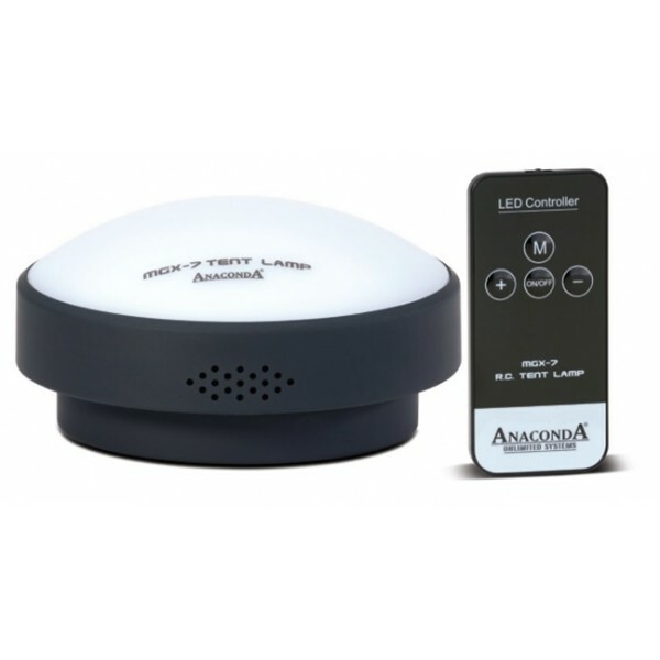 Praktická lampa MGX-7-RC přináší do našeho bivaku spoustu bílého i barevného světla. Lampu lze ovládat pomocí tlačítek na lampě nebo pomocí dálkového ovládání. Má 8 různých úrovní jasu, základní barva je bílá, po záběru začne lampa blikat barvou hlásiče, který hlásí záběr.(4barvy)