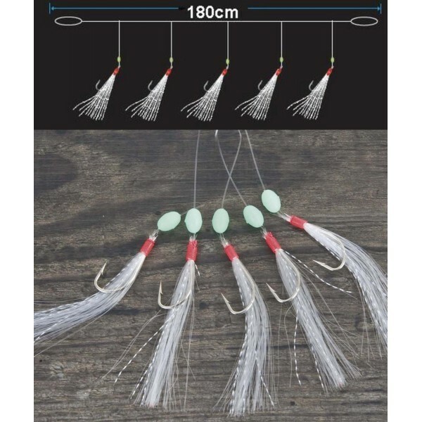 Systém pro lov makrel s pěti háčky. Červeno bílá barva je lákavá. Nad háčkem jsou fluorescenční korálky a na háčku jsou stříbrné střapce.180cm1/00,60mm5311060 przeczytaj całość