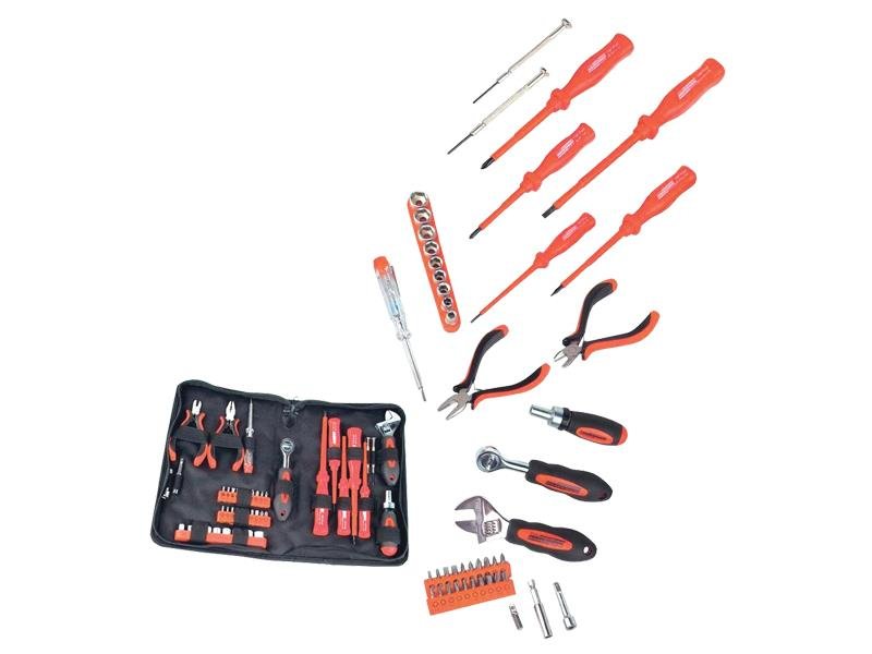Sada nářadí CONRAD 463625 45ks Přiloženo v dodávce: - 5 šroubováků pro elektroniku plochý/křížový PH - 2 šroubováky na jemnou mechaniku - Stranové štípací kleště pro elektroniku - Kombinačky pro elektroniku - Zkoušečka napětí 100 - 250 V - Přepínací ráčna - 9 nástrčných...