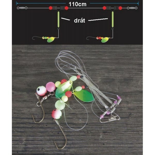 Návazcová souprava. Má dva háčky 4, které jsou od hl. návazcové šňůry odděleny vloženým kouskem průhledné trubičky proti zamotání. Háčky jsou niklové a nad nimi jsou umístěny fluorescenční korálky.110cm40,50mm5310030 przeczytaj całość