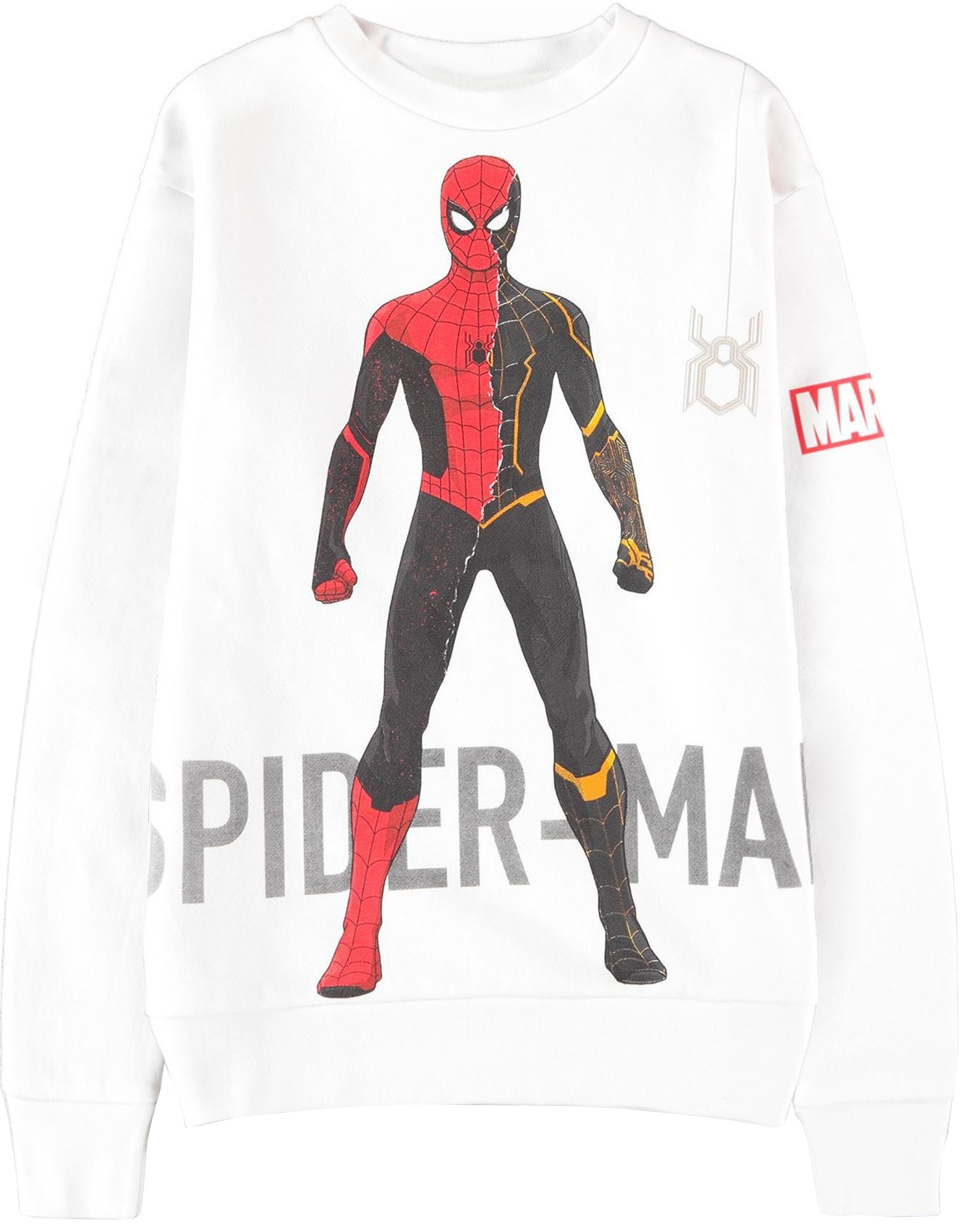Bílý dětský svetr vyvedený v motivu alter ega Spidermana.