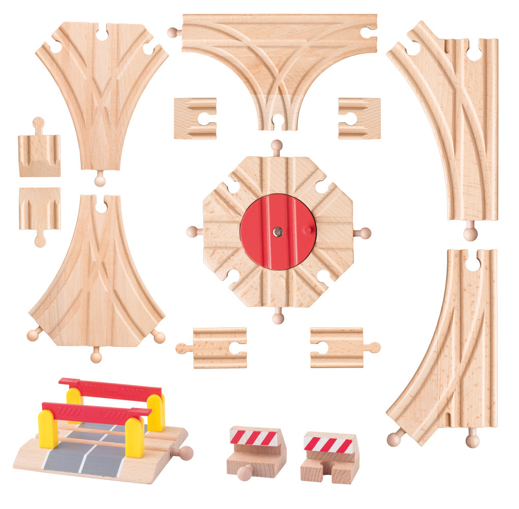 Příslušenství k vláčkodráze  - set kolejí, výhybky, točna, koncovky, přejezd se závorami. Díky této sadě můžete vymýšlet nové možnosti na trati. Koleje jsou vyrobeny z kvalitního dřeva a vynikají perfektním zpracováním. Věk: 3+. Rozměr produktu: 33,5 x 8 x 19 cm przeczytaj całość