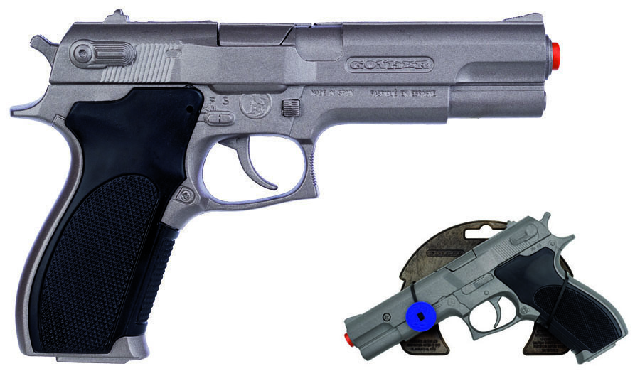 Policejní pistole – kovová, stříbrná, matná na kapsíly – osm ran. Velikost pistole 19,5×12,5 cm. Vyrobeno ve Španělsku. przeczytaj całość