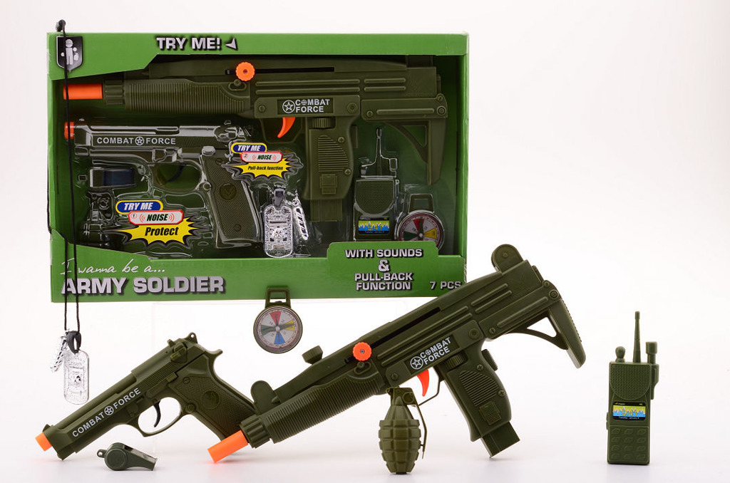 Vojenská sada De luxe obsahuje vojenskou pistoli, samopal, pouta.. przeczytaj całość