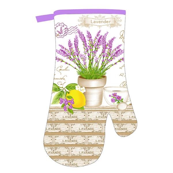 Kuchyňská chňapka - tvar rukavice je vhodná pro chycení a přenášení horkých nádob, pečících plechů z rozpálené trouby nebo na zvedání rozpálené pokličky. Motiv levandule. Materiál - bavlna. Rozměry - 30 x 18 cm. przeczytaj całość