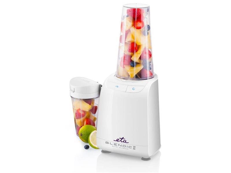 S praktickým a výkonným mixérem ETA Blendic Team II si pohodlně připravíte jak výživné smoothie a večerní koktejly, tak i dětské přesnídávky či pesta. Díky vysoké rychlosti až 21 000 otáček za minutu se vytouženého výsledku dočkáte dokonce během několika málo chvilek. Kvalitní čtyřramenný nůž z odolného nerezu se postará o perfektní konzistenci a zároveň zachová v nápoji maximální množství chuti a zdraví prospěšných látek. V horkých letních dnech se nezalekne ani přípravy ledové tříště, kterou vykouzlí z vody a pár kostek ledu. Dospělé zase jistě potěší ledová káva. Smoothie, proteinový nápoj nebo jiný, živinami nabitý koktejl si můžete vychutnat v pohodlí domova nebo si ho vzít kamkoliv s sebou. Mixovací nádoby totiž zároveň slouží jako přenosné lahve – jednoduše je odejmete z mixéru a šroubovací mixovací nože nahradíte víčkem. V balení najdete hned dvě lahve (700 ml a 500 ml) s těsnícím víčkem, které je navíc opatřeno uzavíratelným pítkem. Díky slim provedení se lahve vejdou do přihrádky v lednici i držáku na kole či v autě. Nádoby jsou vyrobeny z vysoce odolného a zdravotně nezávadného materiálu. Stolní mixér ETA Blendic Team II využijete opravdu při jakékoliv příležitosti. Ať si po náročném tréninku potřebujete dát svůj proteinový nápoj, dětem připravit zdravou přesnídávku z domácích surovin, v létě se osvěžit našlehanou ledovou kávou nebo si raději večer s přáteli chcete dát míchaný koktejl, bude vám vždy po ruce. Stejně jako jeho obsluha, je velmi snadné i jeho sestavení a údržba. Díky automatickému programu s pulzováním si nemusíte dělat starosti se složitým nastavováním – dokonalé smoothie umixuje za vás. Z bezpečnostních důvodů se po minutě automaticky vypne, aby nedocházelo k přehřívání přístroje. Pokud však opravdu nechcete ztrácet čas, využijte funkci PULSE pro okamžitý maximální výkon. Kromě automatického vypnutí se o vaše bezpečí stará i pojistka proti nesprávnému sestavení a protiskluzové nožky, které zajišťují vyšší lepší stabilitu mixéru na pracovní ploše. Povrch je snadno omyvatelný a díky nízké hmotnosti (jen 3 kg) se s celým spotřebičem jednoduše manipuluje.