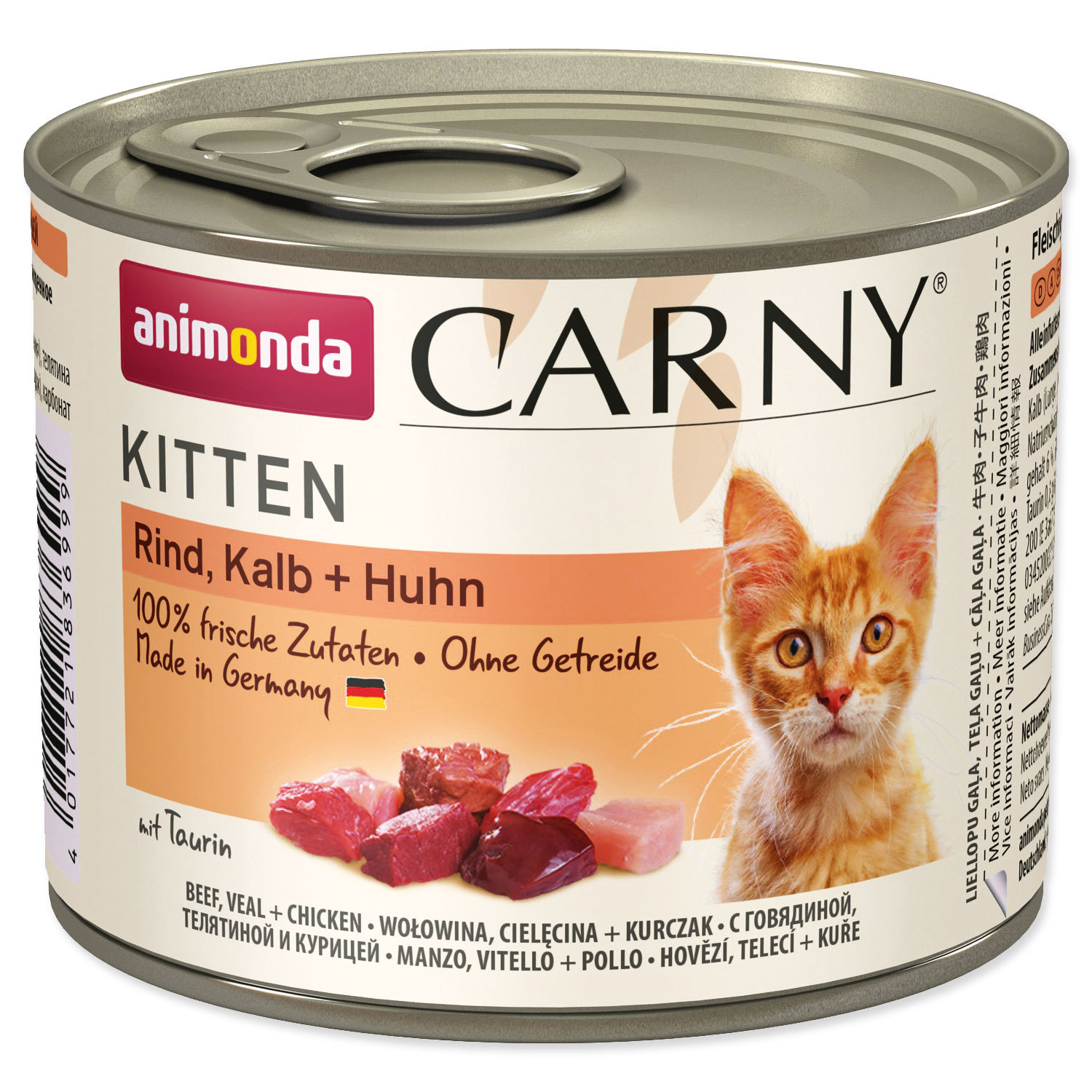 Kompletna karma dla kociąt. Zawiera 100% świeżych surowców, taurynę i jest bezglutenowa. Instrukcja żywienia: zobacz tabelę na opakowaniu. Skład: 32% mięsa wołowego (serce, mięso, nerki, wymiona), 17% cielęciny (płuca, wątroba), 16% kurczaka (wątroba, żołądek), węglan wapnia. Wskaźniki jakości: białko surowe 11%, wilgotność 80%, surowe oleje i tłuszcze 6%, surowy popiół 1,7%, surowe włókno 0,3%, witamina D3 200 j.m./kg, tauryna 0,8 g/kg, jod 0,2 mg/kg, mangan 1,5 mg/kg, cynk 10 mg/kg. Energia metabolizowalna w 100 g: 0,42 MJ.