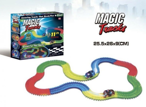 Dráha svítící + auto plast 220ks délka 3,2m na baterie v krabici 26x26x9cm