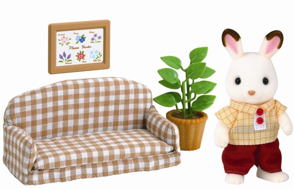 Na sofa v čokoládové barvě si může odpočinout nejen taťka po návratu z práce, ale i zbytek rodinky.Pohovka je dlouhá 10,5 cm , potažená kostkovanou látkou v měkkém provedení. K dispozici je i obrázek k zavěšení s motivem květin. Květina v květníku dosahuje výšky 5 cm a působí jako živá! Sada...
