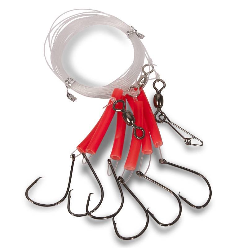Pro větší atraktivitu je systém osazen fluoro převleky. Uprostřed systému je obratlík, který eliminuje možnost zamotání. Cílová ryba je okouník.délka návazce 6,00 mkmenový vlasec 0,90 mmvelikost háčků 8/0barva fluoro červená przeczytaj całość