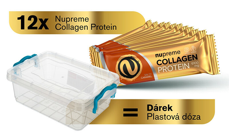 Proteinové tyčinky s kolagenem, slaným karamelem + plastová dóza jako dárek.Proteinová tyčinka s kolagenem obsahuje 36% kvalitních bílkovin, z toho více než 6 g tvoří špičkové kolagenové peptidy. Je bezlepková a celá zabalená do lahodné voňavé čokolády s nízkým obsahem cukru. Mlsání bez výčitek,...