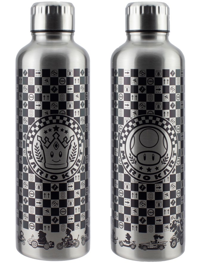 Nerezová láhev na pití se šroubovacím víčkem a motivem Mario Kart.