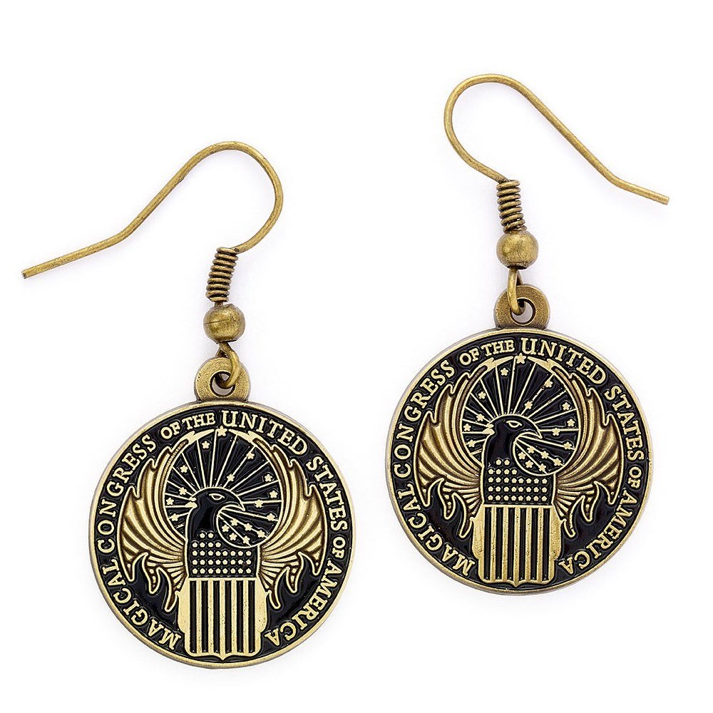 Náušnice podle filmu Fantastická zvířata a kde je najít se znakem Magického kongresu, povrch je pokryt starožitně vypadající mosazí. przeczytaj całość