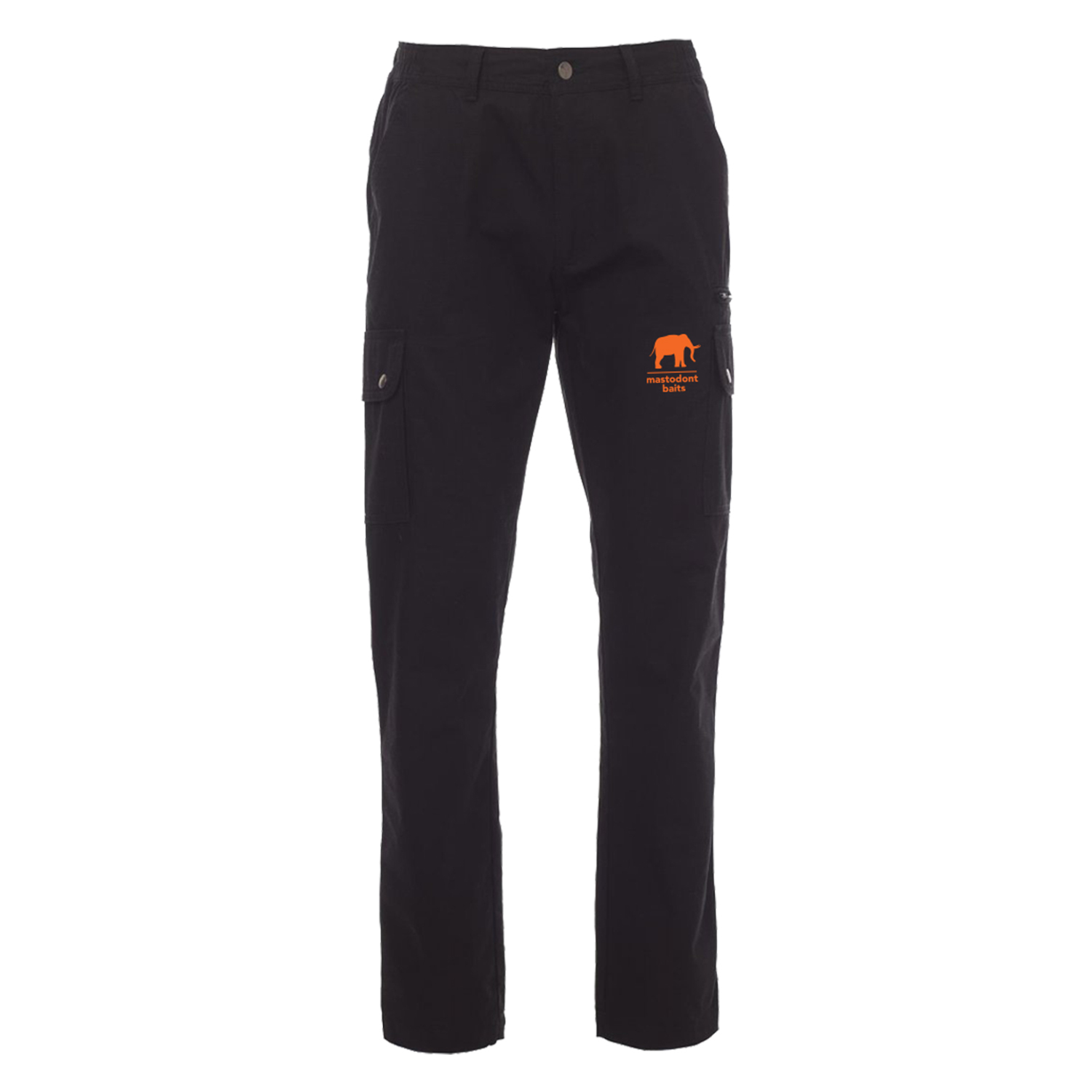 Pánské kalhoty v černé barvě, letní, elastické pásky na bocích a poutka v pase, zapínání na zip a na kovový knoflík, dvě přední kapsy klasického střihu, dvě postranní kapsy s klopou a druky, jedna kapsa na zip po levé straně, skrytá kapsa na svinovací metr po pravé straně, dvě zadní prostřižené...