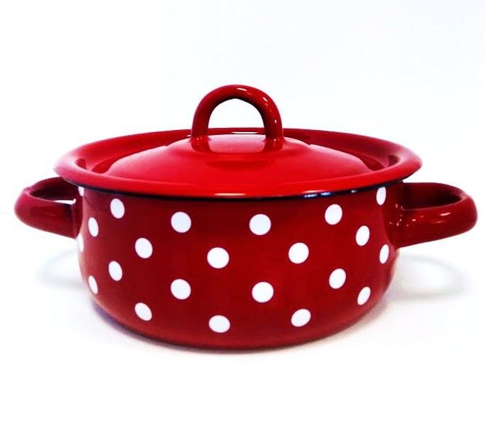 Emalia jest używana w kuchni od wielu lat. Emaliowany garnek to doskonały pomocnik do przygotowywania wszelkich potraw, ale można go też użyć jako element dekoracyjny, który wniesie do każdego domu czy domku odrobinę radosnego nastroju. Nadaje się do wszystkich rodzajów kuchenek, łącznie z indukcyjnymi. Garnek ma 2 praktyczne uchwyty ułatwiające manipulację. Ten emaliowany garnek oferujemy w czerwonym kolorze z białymi kropkami o pojemności 1,5 l.