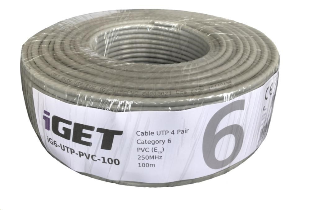 Kabel drát CAT6 nestíněný s pláštěm PVC a třídou reakce na oheň Eca.Technické parametry:Produktové označení: iG6-UTP-PVC-100EAN: 8594177652671Kategorie: CAT6Standardy: ANSI/TIA-568-C.2, RoHS 2.0., TS 50576, EN 13501-6, EN 50575, EN 60332-1-2Stínění: neŠířka pásma: 250 MHzTyp a velikost vodiče:...