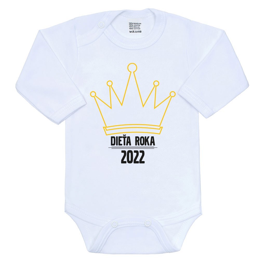 Originální bavlněné kojenecké body s dlouhým rukávem New Baby, s vtipným nápisem DIEŤA ROKA 2022. Barvy použité k potisku jsou certifikované a vhodné pro miminka. Je vyrobeno z příjemného a kvalitního materiálu, ve kterém se bude Vaše miminko cítit příjemně. Body má zapínáni na cvočky na ramínku...