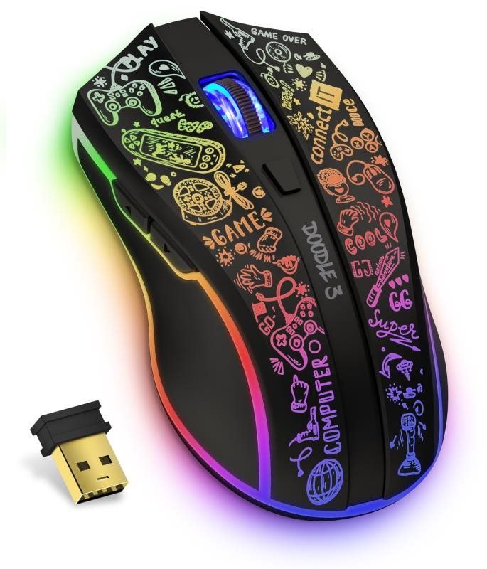Profesjonalna bezprzewodowa mysz gamingowa DOODLE 3 dla graczy komputerowych z podświetleniem Rainbow. Dostarczane oprogramowanie z wieloma ustawieniami obsługuje makra użytkownika, 5 profili użytkownika oraz 6 programowalnych przycisków łącznie z rolką. Precyzyjny sensor optyczny ma regulowaną czułość do 4800 DPI. Mysz wykorzystuje technologie takie jak powierzchnia RubberGrip zapobiegająca ślizganiu dłoni, ślizgi UltraSlides Black zapewniające maksymalną prędkość na podkładce. Nie brakuje także technologii AutoPowerSave oszczędzającej energię baterii. Oprogramowanie jest dostępne do darmowego pobrania na stronie www.connectit-europe.com. Oczywiście w zestawie znajduje się pozłacany odbiornik USB Nano oraz dołączony kabel do ładowania.