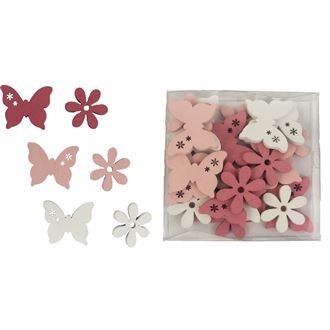 Sada dekoračních přízdob.Sada obsahuje 24 přízdob.Kytky mají průměr 2,8 cm, tloušťku 0,5 cm.Motýlci mají šířku 3,5 cm, tloušťku 0,5 cm, výšku 2,7 cm.Barva : bílá, sv.růžová, tm.růžová. Materiál na bázi dřeva. przeczytaj całość